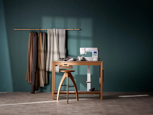 Sjöbergs Symaskinsbord är ett helt nytt bord för funktionell sömnad och förvaring av symaskin. Bordet kan också användas till andra arbeten. Du kan höja och sänka symaskinen steglöst och nästan ljudlöst genom en knapptryckning. Sjöbergs symaskinsbord har en laminerad skiva och finns i två färger, mörk- och ljusgrå eller med Sigvard Bernadottes välkända mönster Virrvarr från 1958. Bordet kan också levereras som arbetsbord med hel skiva utan hiss.